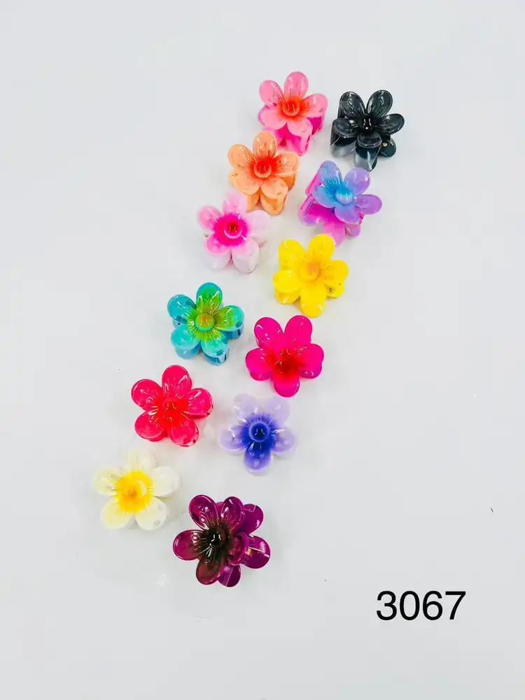 Accesorio tipo garra en tamaño mini, diseño floral compacto con acabado brillante translúcido. Producto juvenil, llamativo y de alta rotación.
