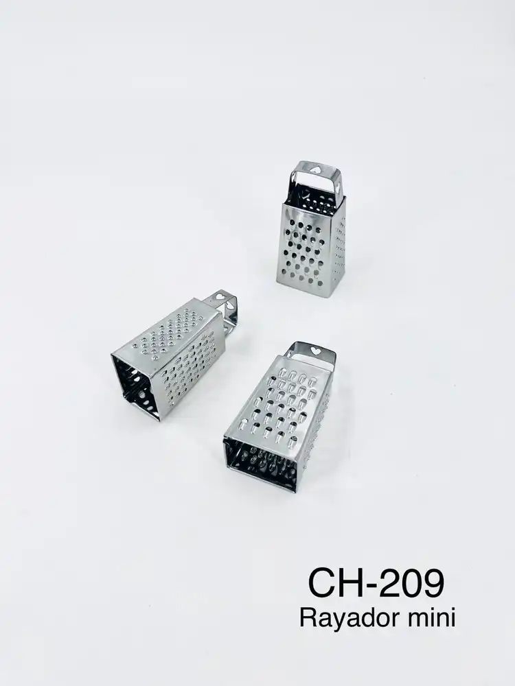 Fabricado en metal resistente con acabado brillante, este pequeño accesorio imita el diseño de un rayador tradicional, pero en un formato miniatura pensado principalmente para decoración. Su tamaño compacto lo hace perfecto para utilizar como adorno, souvenir o detalle creativo en la cocina.