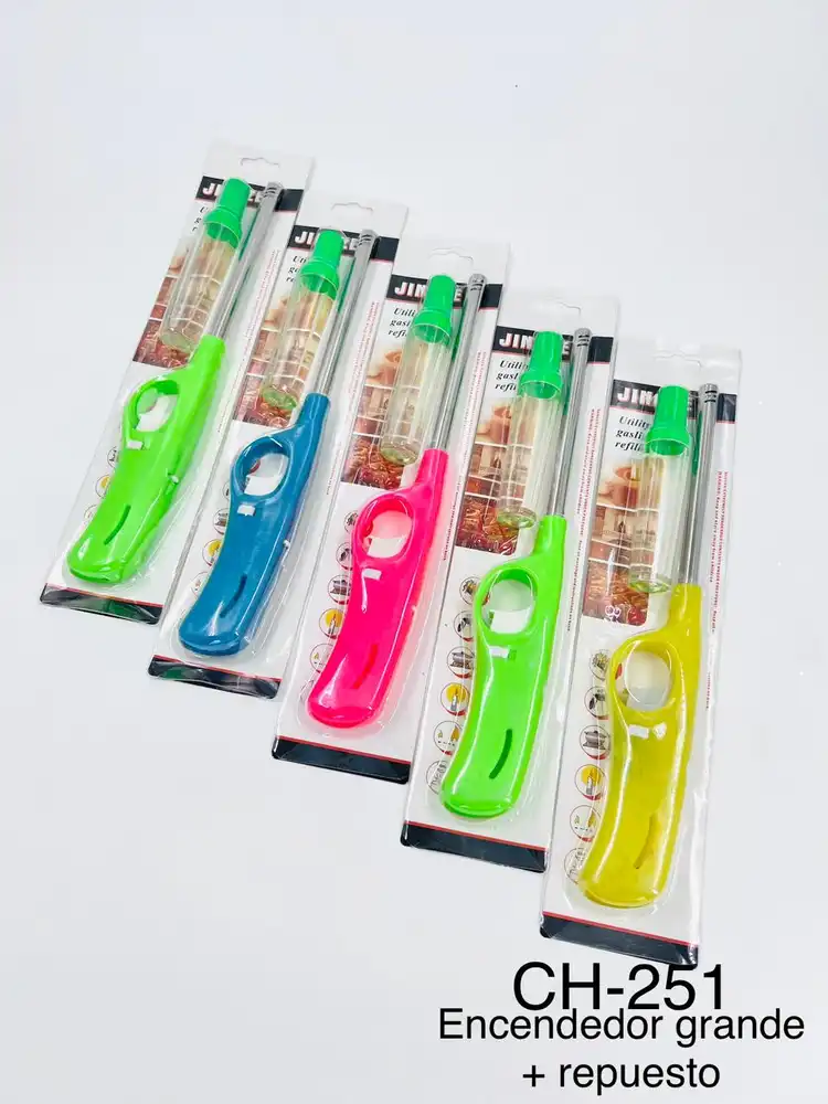 El encendedor grande con repuesto de gas es una herramienta práctica y funcional diseñada para facilitar el encendido de velas, estufas, parrillas y otros elementos del hogar. Gracias a su diseño de cuello largo, permite alcanzar zonas profundas o de difícil acceso de manera segura y cómoda.