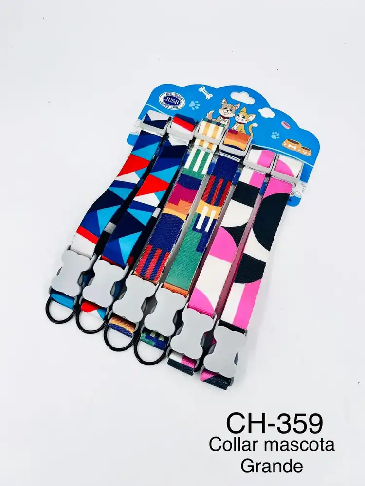 Su diseño cuenta con estampados coloridos y modernos, que brindan un estilo único y llamativo. Además, incorpora una hebilla de seguridad plástica resistente que permite poner y quitar el collar fácilmente, junto con un aro metálico ideal para sujetar correas o identificaciones.