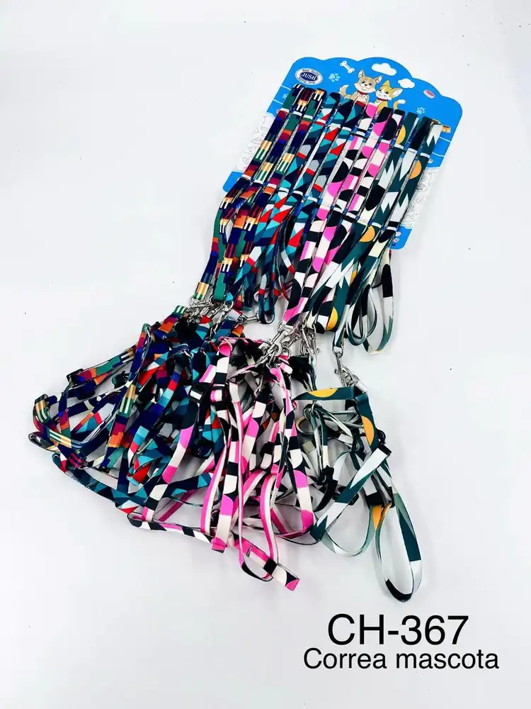 Cuenta con diseños geométricos coloridos y llamativos, ideales para darle un estilo único a tu mascota. Su mosquetón metálico reforzado permite sujetar la correa al collar de forma segura y rápida.