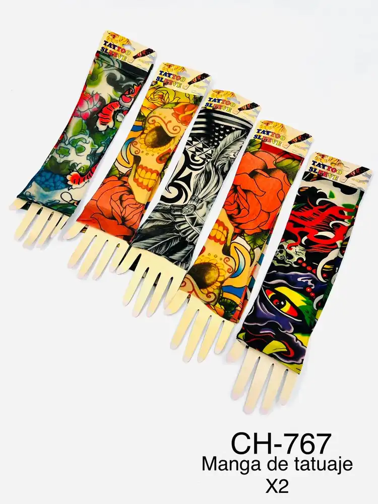 Fabricadas con material elástico, ligero y cómodo, se adaptan fácilmente al brazo ofreciendo un ajuste firme y natural. Sus diseños coloridos y detallados imitan diferentes estilos de tatuaje, creando un efecto visual impactante.