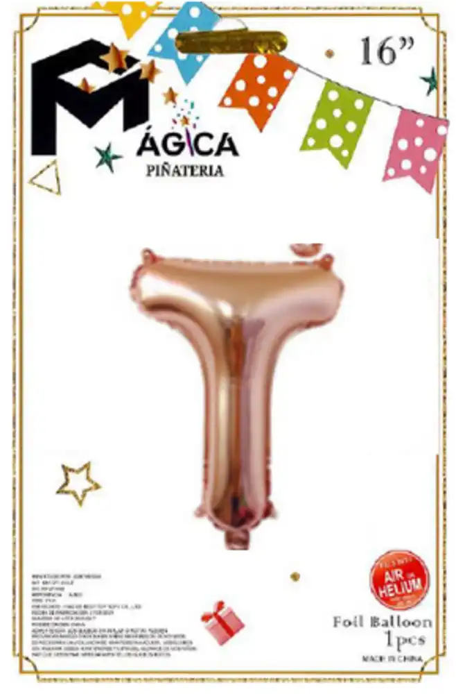 Globo decorativo en forma de letra “T” mayúscula, fabricado en foil metalizado de alta calidad. Su color oro rosa combina la elegancia del dorado con un matiz rosado sutil, creando un efecto visual moderno y muy atractivo.