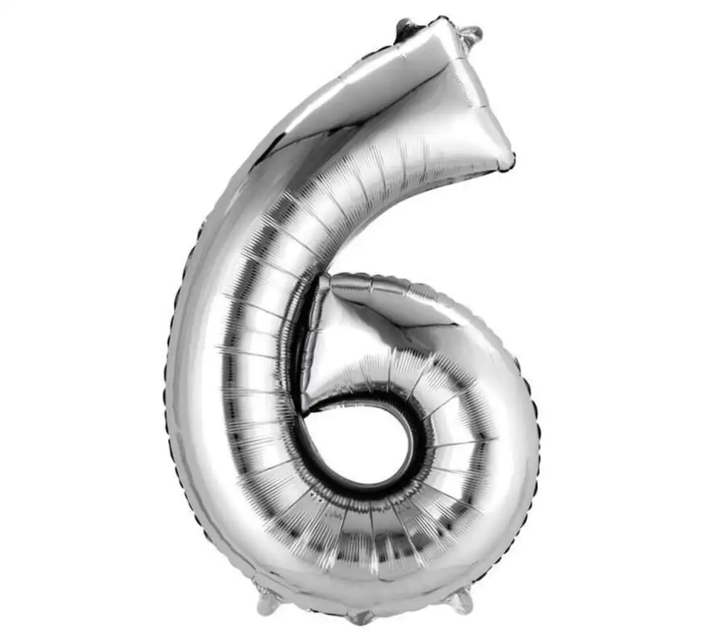 Globo en forma del número 6 en color plateado metalizado. Ideal para cumpleaños, aniversarios y combinaciones como 6, 16, 26, 60, etc.