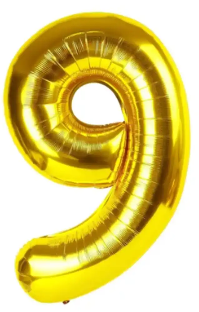 Globo en forma del número 9 en color dorado metalizado. Ideal para cumpleaños, aniversarios y combinaciones como 9, 19, 29, 90, etc., aportando elegancia y protagonismo a la decoración.