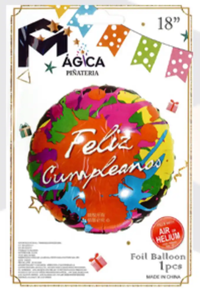 Globo redondo con fondo naranja y pinceladas en colores vibrantes y mensaje “Feliz Cumpleaños” en el centro.