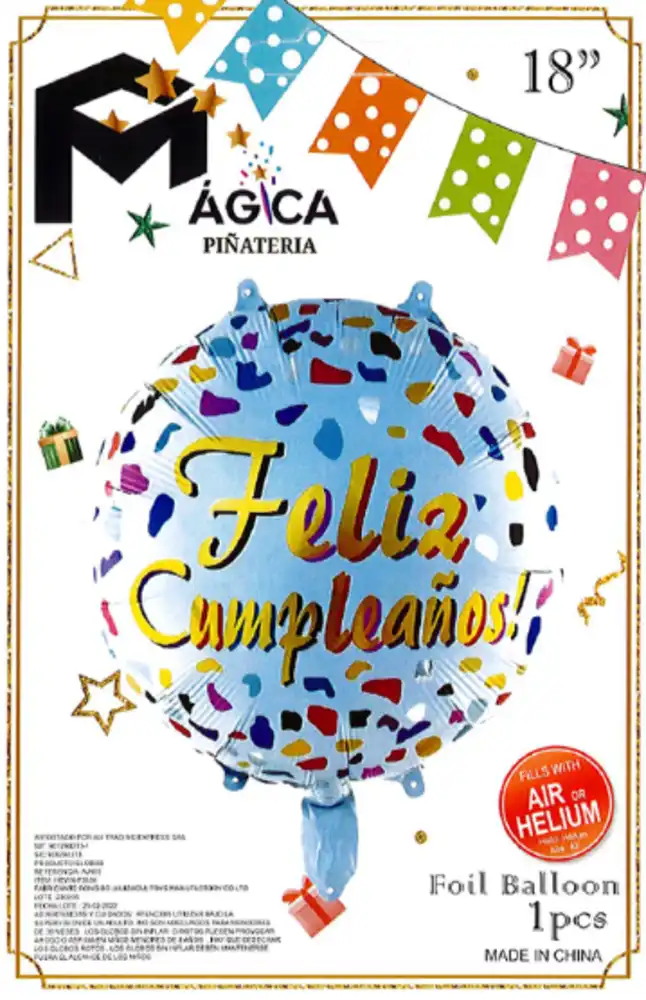 Globo redondo de 18 pulgadas, diseño con fondo azul claro y detalles de confeti multicolor. Lleva la frase “Feliz Cumpleaños” en letras doradas llamativas.