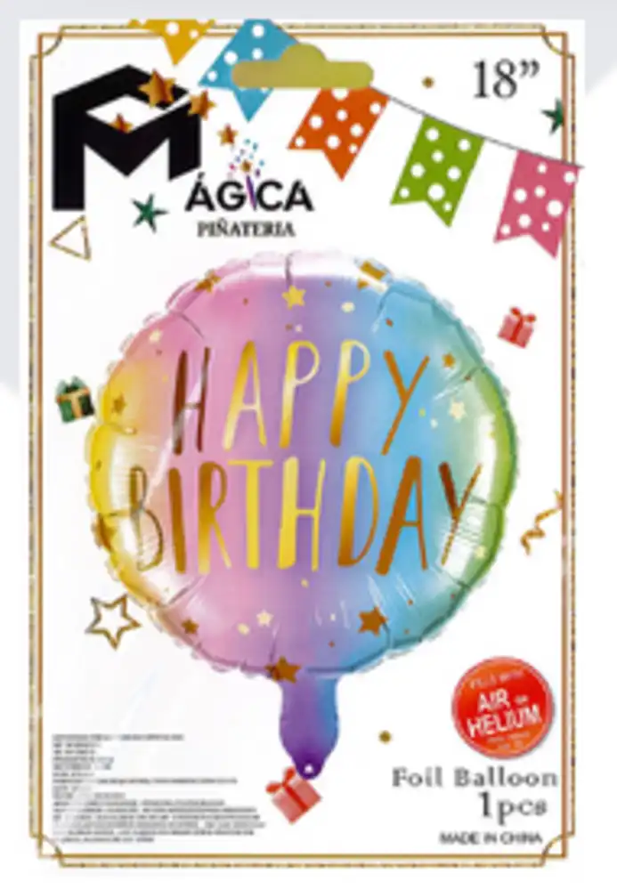 Globo redondo con efecto degradado en tonos pastel decorado con pequeñas estrellas y mensaje central “Happy Birthday”.