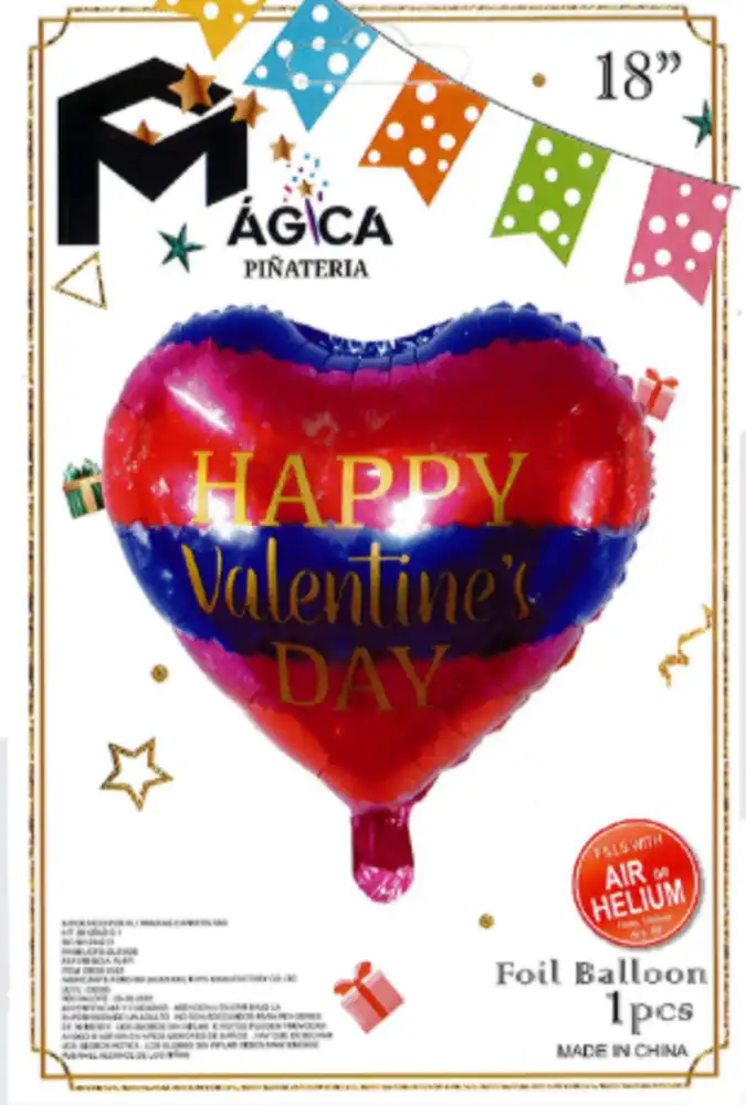 Sorprende con un diseño elegante y llamativo con nuestro Globo Metálico en forma de corazón “Happy Valentine’s Day” Bicolor de 18 pulgadas. Presenta un contraste vibrante en tonos rojo y azul con acabado brillante, acompañado de tipografía dorada que resalta el mensaje romántico.
