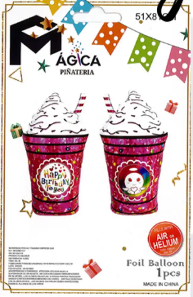Divertido globo metálico en forma de malteada / batido con crema y popote, ideal para decoraciones de cumpleaños infantiles y temáticas dulces. Su diseño colorido con detalles festivos lo convierte en un elemento llamativo para mesas principales y fondos fotográficos.