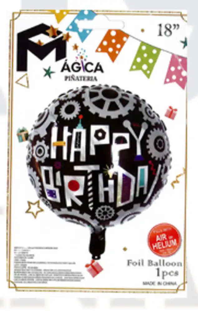 Celebra con un estilo moderno e industrial con nuestro Globo Metálico Redondo “Happy Birthday” Diseño Mecánico de 18 pulgadas. Presenta un fondo negro con engranajes y elementos gráficos en tonos plateados y blancos, combinados con detalles de color que resaltan el mensaje central con una estética urbana y contemporánea.